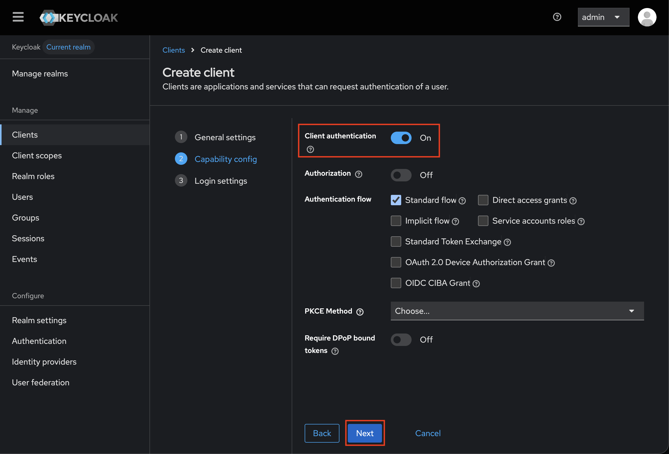 To enable SSO with Keycloak, you first need to create a client in your Keycloak instance. Log in to Keycloak, choose the correct Realm, then navigate to Clients and click Create client.