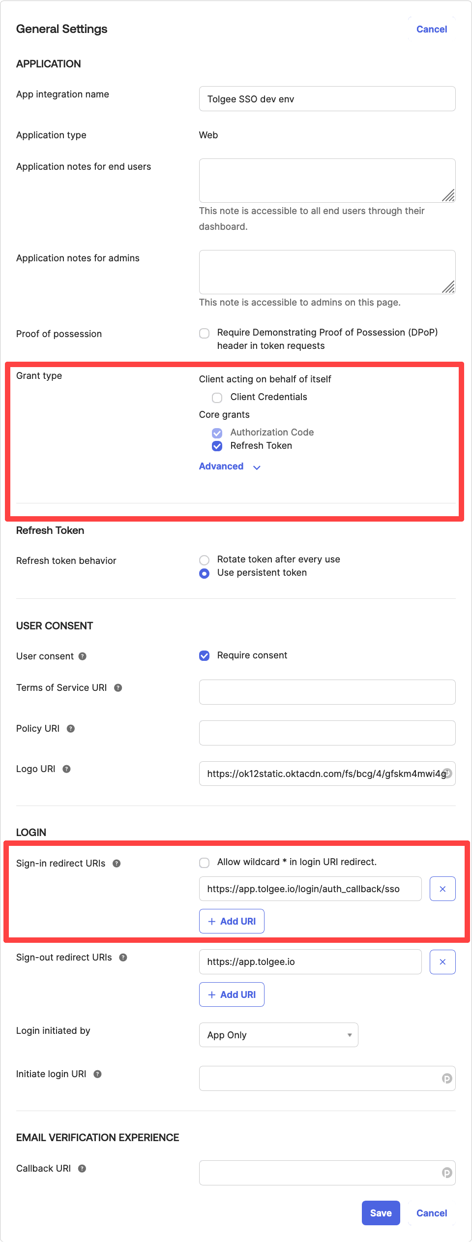 - Login redirect URIs: https://app.tolgee.io/login/auth_callback/sso (if you use Tolgee cloud) or your Tolgee instance URL ending with